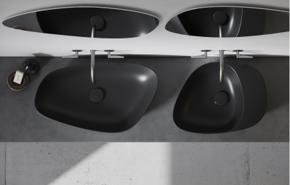 Umywalki dostępne są w trzech wariantach kolorystycznych: biały matowy, biały błyszczący oraz antracytowy mat, co daje szerokie możliwości aranżacyjne. Spójna stylistyka kolekcji umożliwia łączenie różnych rozmiarów, form i kolorów w ramach jednego projektu, tworząc estetyczne, a zarazem niebanalne kompozycje. Asymetryczne kształty i odważna kolorystyka – zwłaszcza matowy antracyt – doskonale wpisują się zarówno w nowoczesne, jak i bardziej klasyczne aranżacje łazienek.