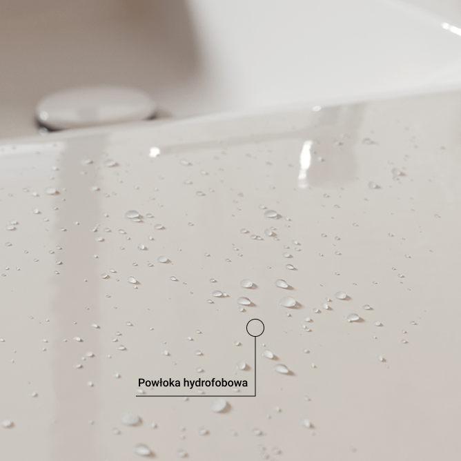 Powłoka hydrofobowa to nowoczesny i komfortowy sposób na zapewnienie czystej powierzchni ceramiki łazienkowej. Wywołuje ona efekt podobny do natłuszczenia, dzięki czemu krople wody łączą się ze sobą w większe i nie przywierają do tafli. Powłoka hydrofobowa sprawia, że woda jest dużo łatwiejsza do usunięcia, przez co blaty umywalek wiszących zostają suche i mogą służyć jako wygodna przestrzeń do przechowywania akcesoriów toaletowych.